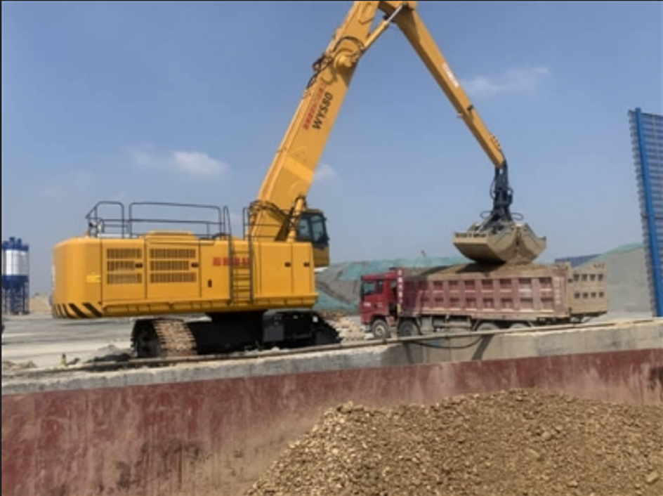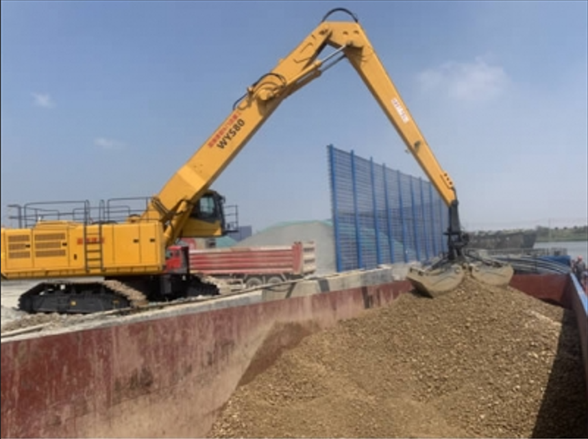 This heavy-duty grab is a patented product of "double power" invention with internal combustion engine and 380V electric interchange operation, which is optimized, designed and refitted on the basis of the structure of the 70 ton mining shovel imported from Liebherr in China. This "heavy-duty, high mobility" energy-saving and environmentally friendly bulk cargo handling and grab operation equipment.
